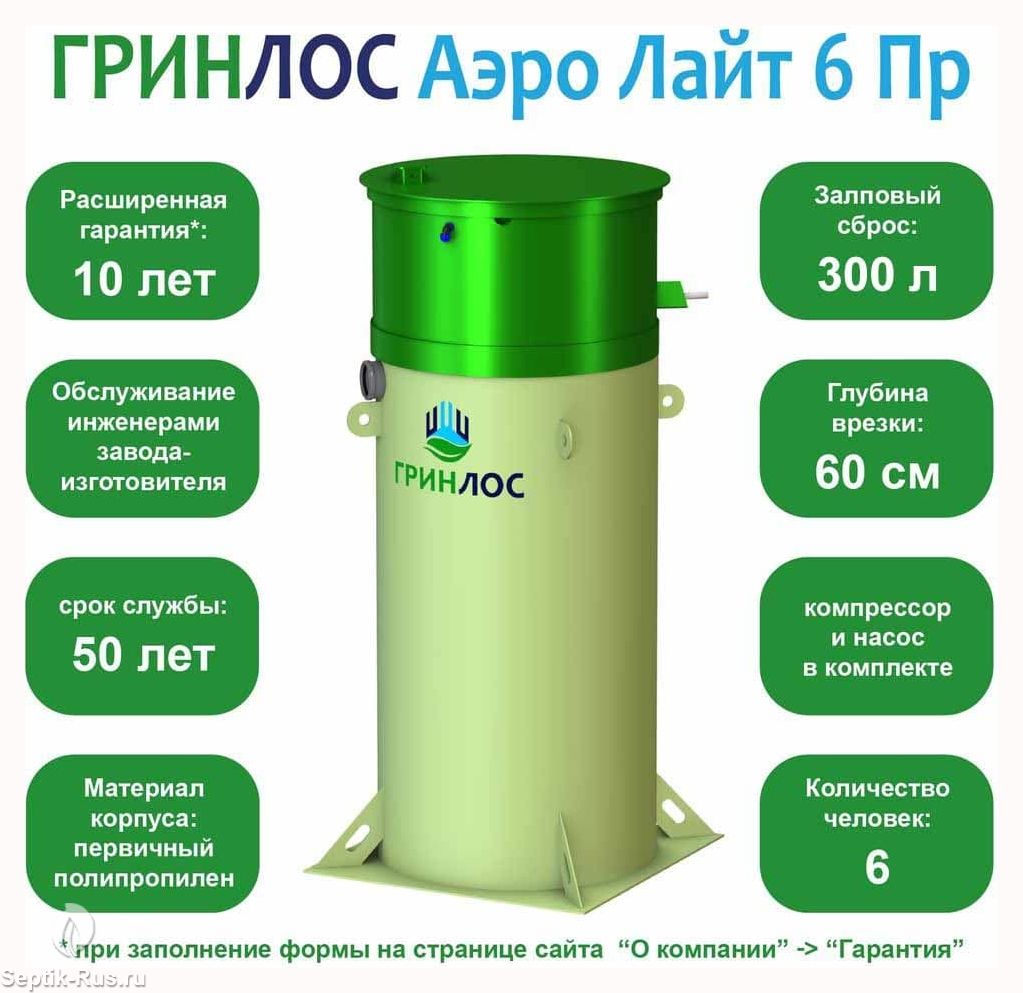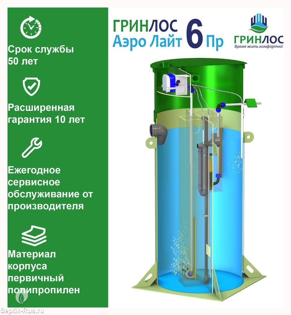 Доставим и установим септик Гринлос Аэро Лайт 6 Пр за 1 день по цене ниже конкурентов и скидкой на монтаж до 29%. Звоните!