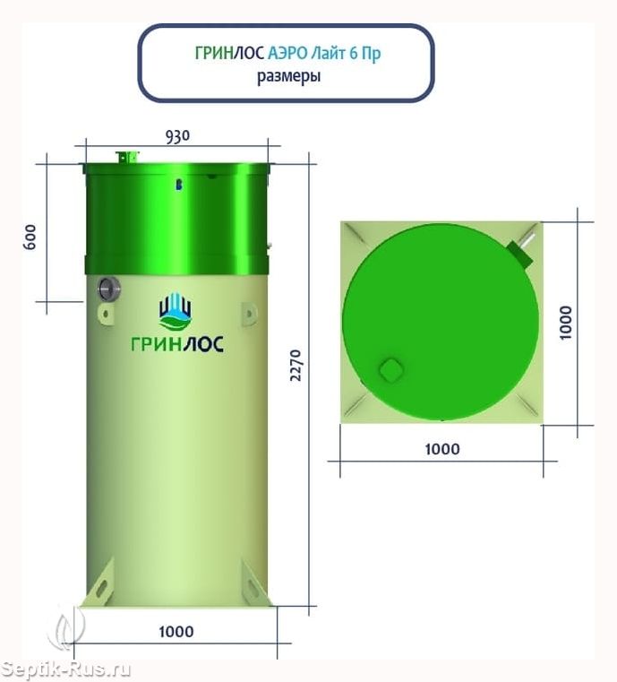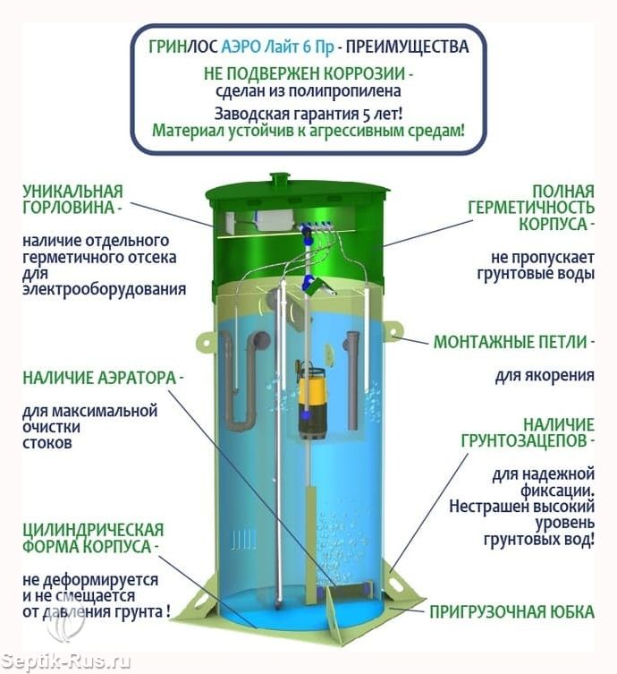 Модификация Гринлос Аэро Лайт 6 Пр выступает менее затратной в изготовлении и эксплуатации относительно септика Аэро .