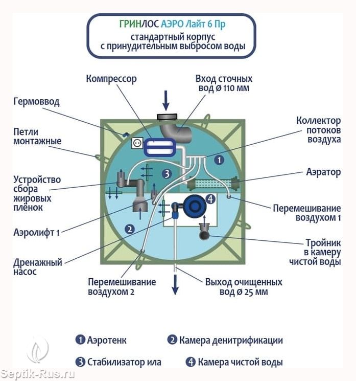 Станция Биологической Очистки Гринлос Аэро Лайт 6 Пр предназначены для расщепления и переработки основных органических загрязнений, содержащихся в бытовых сточных водах. Эти процессы происходят в результате жизнедеятельности аэробных микроорганизмов, условия для жизнедеятельности которых создает септик.