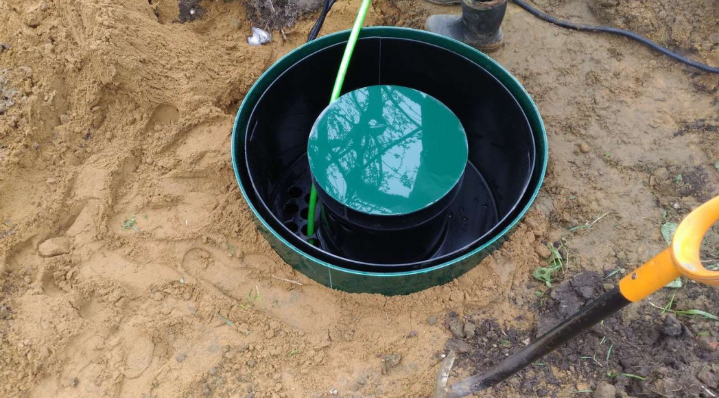 Схема с отводом очищенных сточных вод в фильтрующий колодец. Подходит для хорошо поглощающих грунтов (песок, супесь) и низкого уровня грунтовых вод.